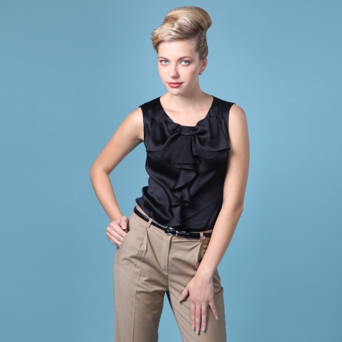Шелковая блузка без рукавов, с декоративным бантом, переходящим в жабо.