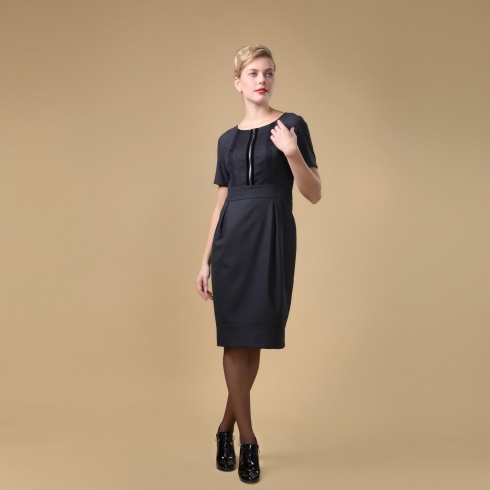 Платье-футляр, декорированное металлическими украшениями. Рукава "три четверти".