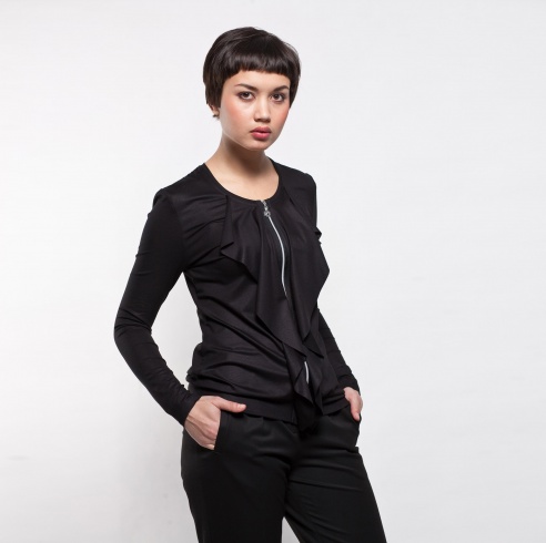 Трикотажная блуза на молнии, с длинным рукавом. С эффектным объемным воланом.