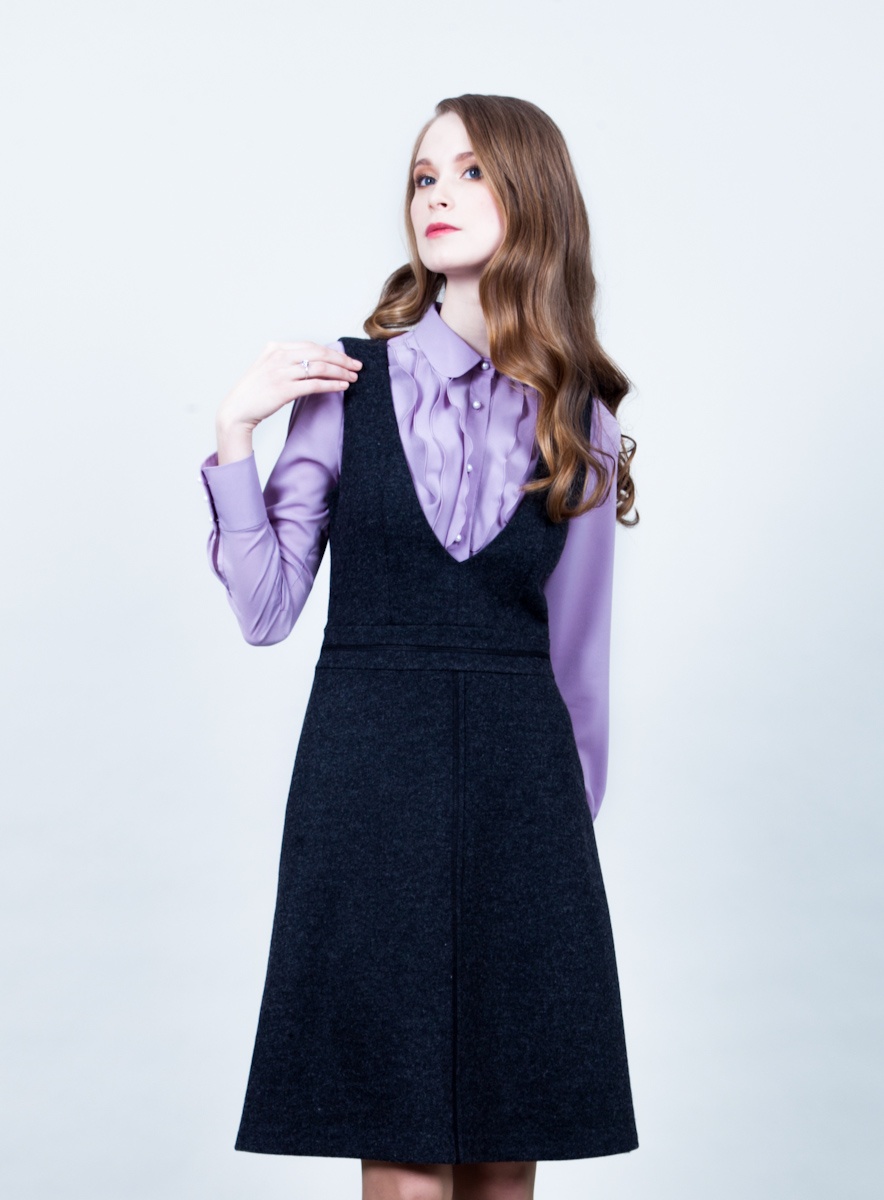 Сарафан приталенного силуэта, лиф малого объёма, с глубоким V-образным вырезом. Юбка расширенная к низу, пояс-подрез и средние швы юбки оформлены декоративной строчкой, с вложением тесьмы. Сарафан на подкладе.