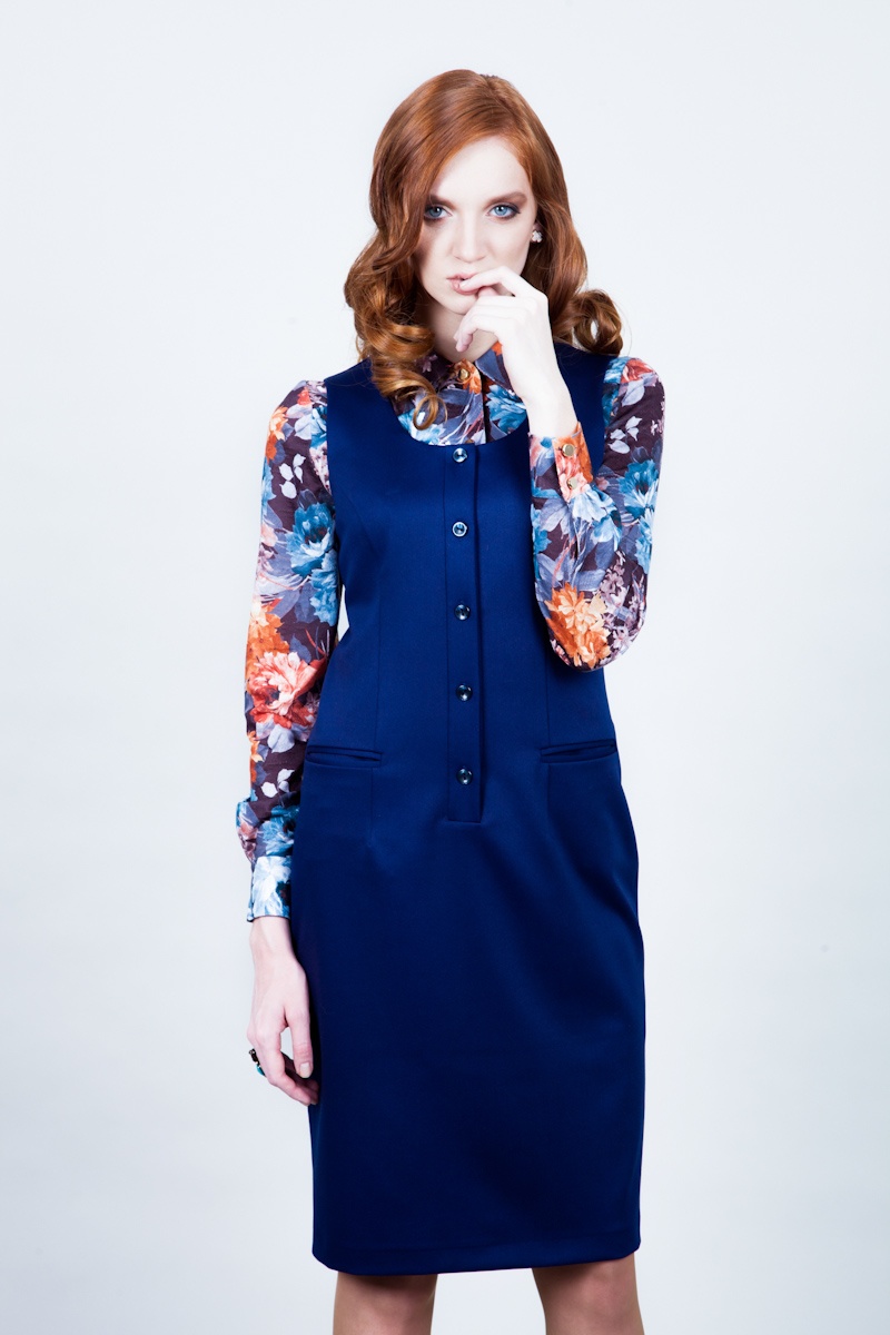 Платье-сарафан приталенного силуэта. Горловина округлая. На полочке полурельефы, выходящие из проймы до линии входа в карман. Карманы прорезные в рамку. Шлица в среднем шве спинки. Сарафан на подкладе.