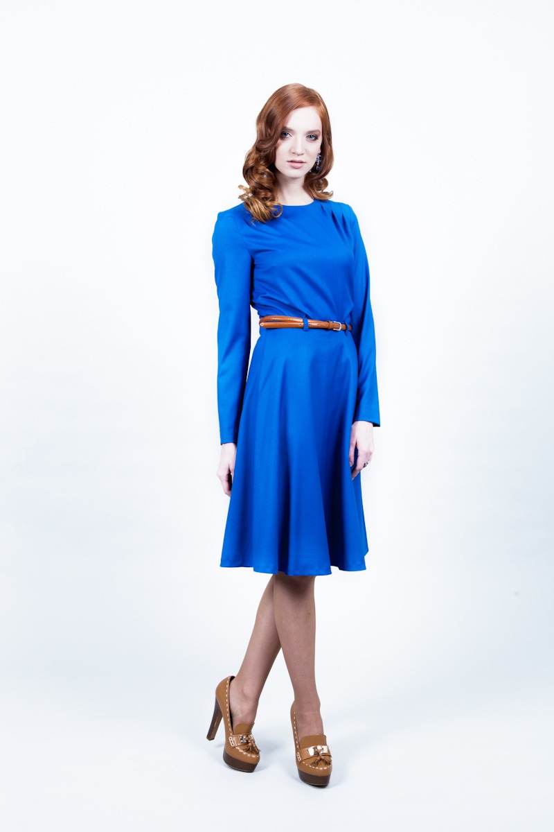 Платье полуприлегающего силуэта на подкладе, отрезное по линии талии. С тремя мягкими складками, выходящими из плечевого шва. Юбка расширенная к низу. Застёжка на потайной молнии в среднем шве.