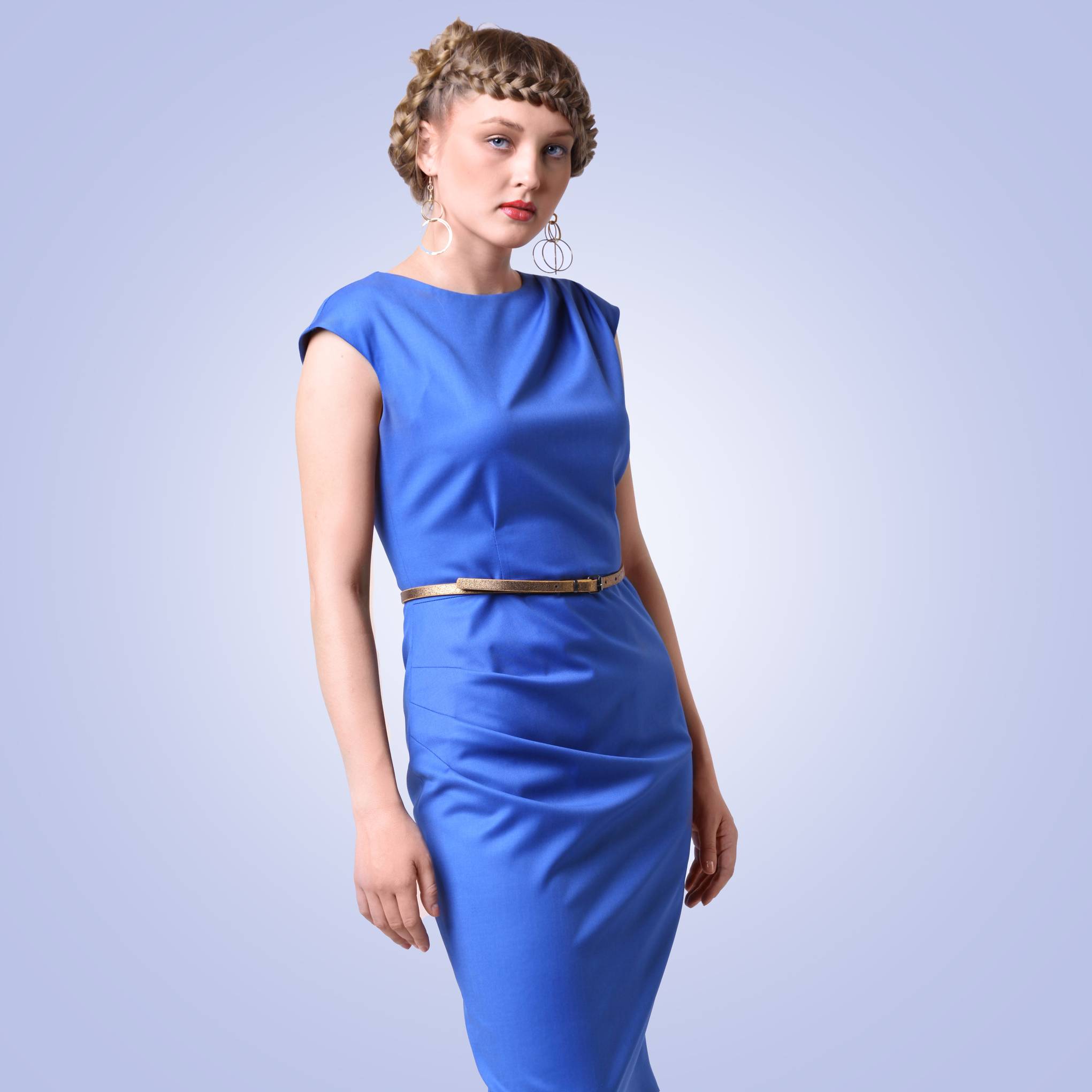 Платье на подкладе с ассиметричной драппировкой, со спущенным рукавом, с отрезной полочкой по линии талии и цельной спинкой. Застёжка на молнию в среднем шве, сзади шлица.