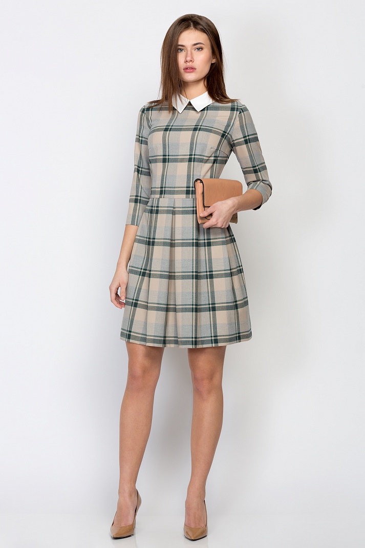 Стильное платье в клетку из ткани средней плотности, очень приятной к телу. Лиф рельефный, отрезной по линии талии, юбка с аккуратными складками. Белый воротничок пристегивается на пуговицах. Рукав 3/4, застежка-молния на спинке. Платье без подкладки. Отличный молодежный вариант.