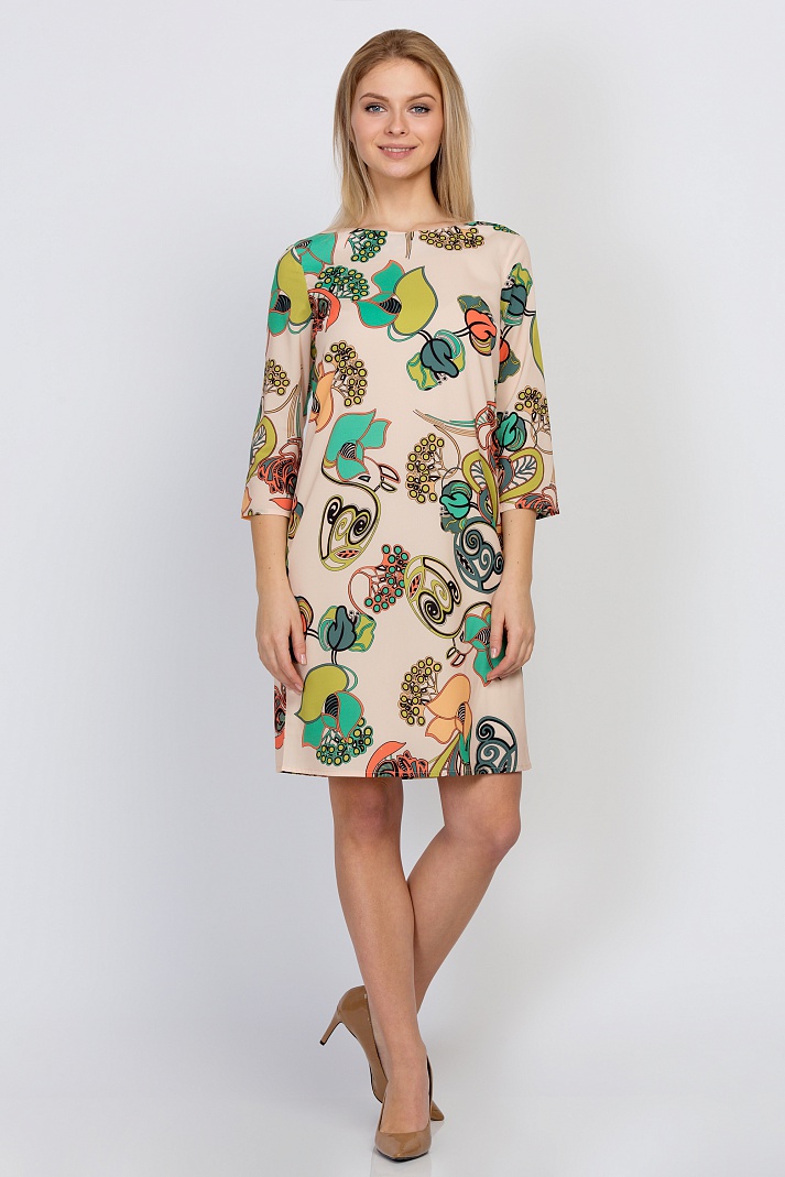 Стильное платье прямого кроя. Ткань легкая, очень приятная на ощупь цвета крем-брюле с оригинальным принтом. Есть тонкая хлопчато-бумажная подкладка с эффектом эластичности. Рукав 3/4, на спинке застегивается на аккуратную пуговицу в тон. Очень удобное и комфортное платье, отлично подойдет как для офиса, так и для коктейльной вечеринки.