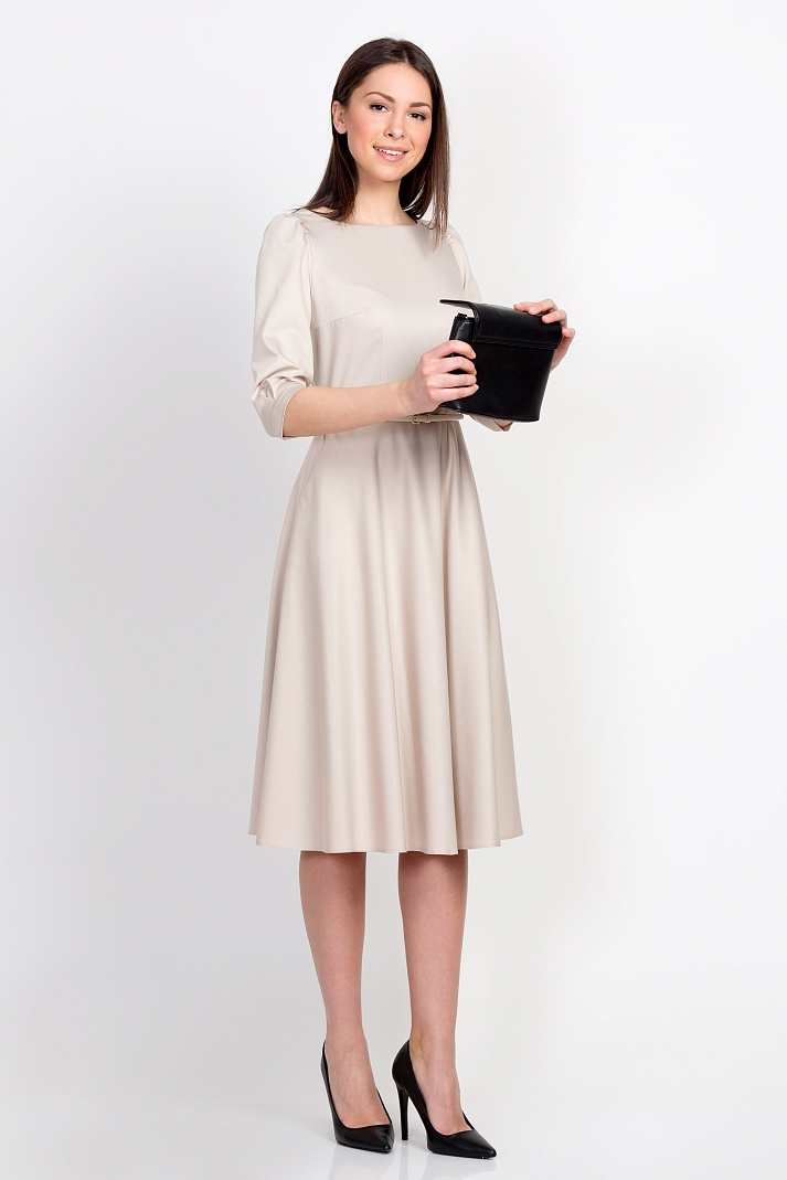 Женственное платье классического силуэта, который подчеркивает все достоинства фигуры. Ткань легкая светло-бежевого цвета очень приятная на ощупь. Рукав 3/4 с легкими сборками по плечу, есть два элегантных кармана по бокам, застежка-молния с левого бока. На поясе есть шлевки, ремешок продается отдельно. Без подкладки. Платье отлично подойдет для повседневной носки, а с аксессуарами станет отличным выбором для романтического свидания.