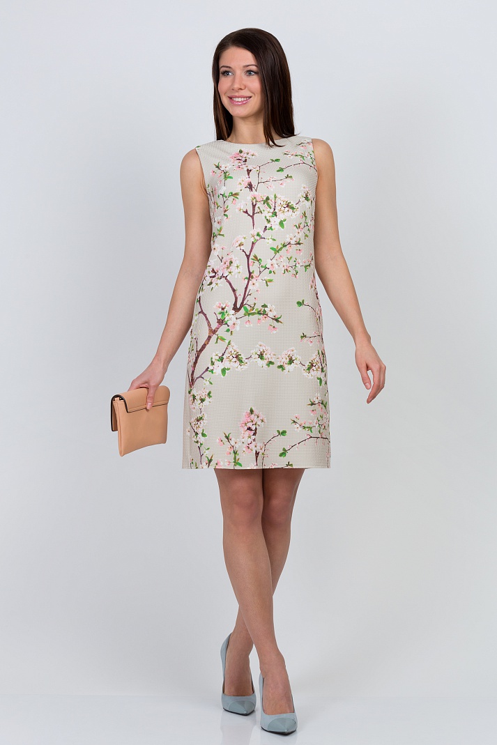 Легкое приталенное платье бежевого цвета с нежным цветочным принтом. Ткань мягкая с оригинальной текстурой, очень приятная к телу. Платье без подкладки, на спинке застежка-молния. Отличный вариант на повседневную носку, хорошо сидит по фигуре, благодаря эластичности ткани мягко облегает силуэт.