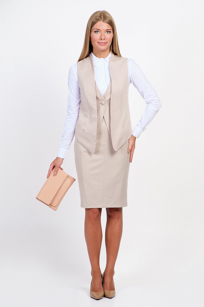 Элегантный жилет в классическом стиле с оригинальным кроем. Ткань средней плотности, приятного бежевого цвета. Спереди оформлена внутренней фигурной планкой на пуговице, обшитой тканью в тон модели, и украшена неглубокими декоративными кармашками. Спинка укороченная, есть легкая подкладка из полиэстера. Идеально подойдет для офиса и создания строгого делового образа.