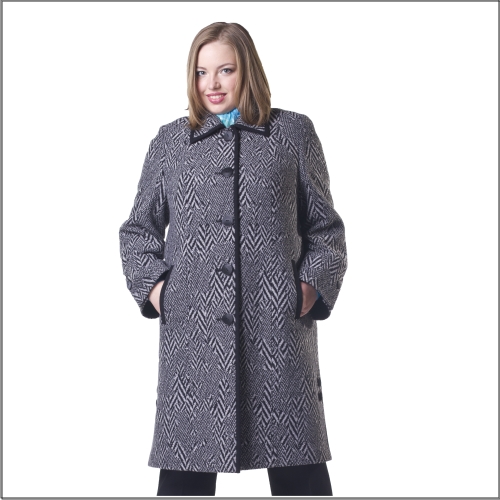 Укороченное прямое пальто в стиле «casual». Предложение для современных женщин, чьи приоритеты в выборе одежды - актуальный дизайн, но не авангард, элегантность, комфорт, защита от непогоды. Игра рисунка ткани (разномасштабная "елочка") в сочетании с контрастной отделкой деталей придают модели особый шарм, создают современный городской образ. А модная черно-белая гамма позволяет использовать аксессуары практически любого оттенка, на вкус обладательницы пальто.