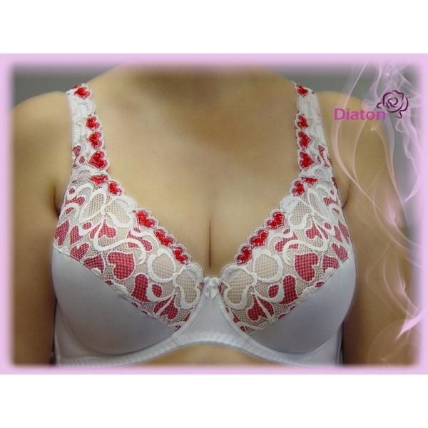 Бюстгальтер на каркасах. Боковая деталь стана усилена региленами. Чашка с диагональным швом, верхняя часть чашки и передняя часть бретели выполнена из кружева. Боковая часть верха чашки и кружевная бретель усилена неэластичной сеткой. Нижняя деталь чашки выполнена из трикотажного полотна и х/б подкладки. Широкая боковая деталь создает комфортную поддержку.